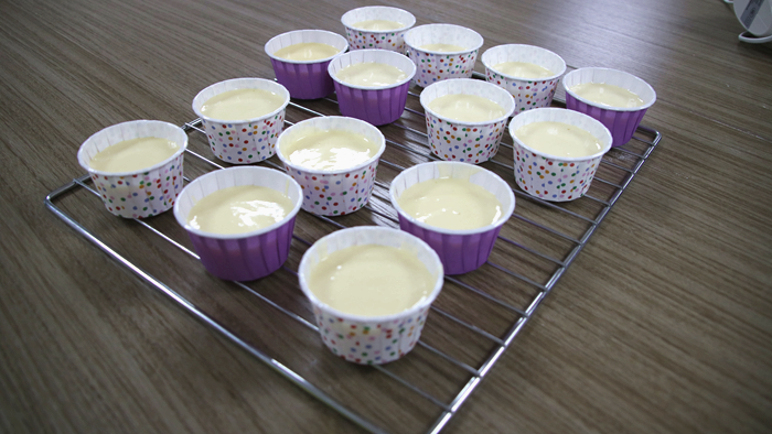 將做好的蛋糕液細心地裱入紙杯中,